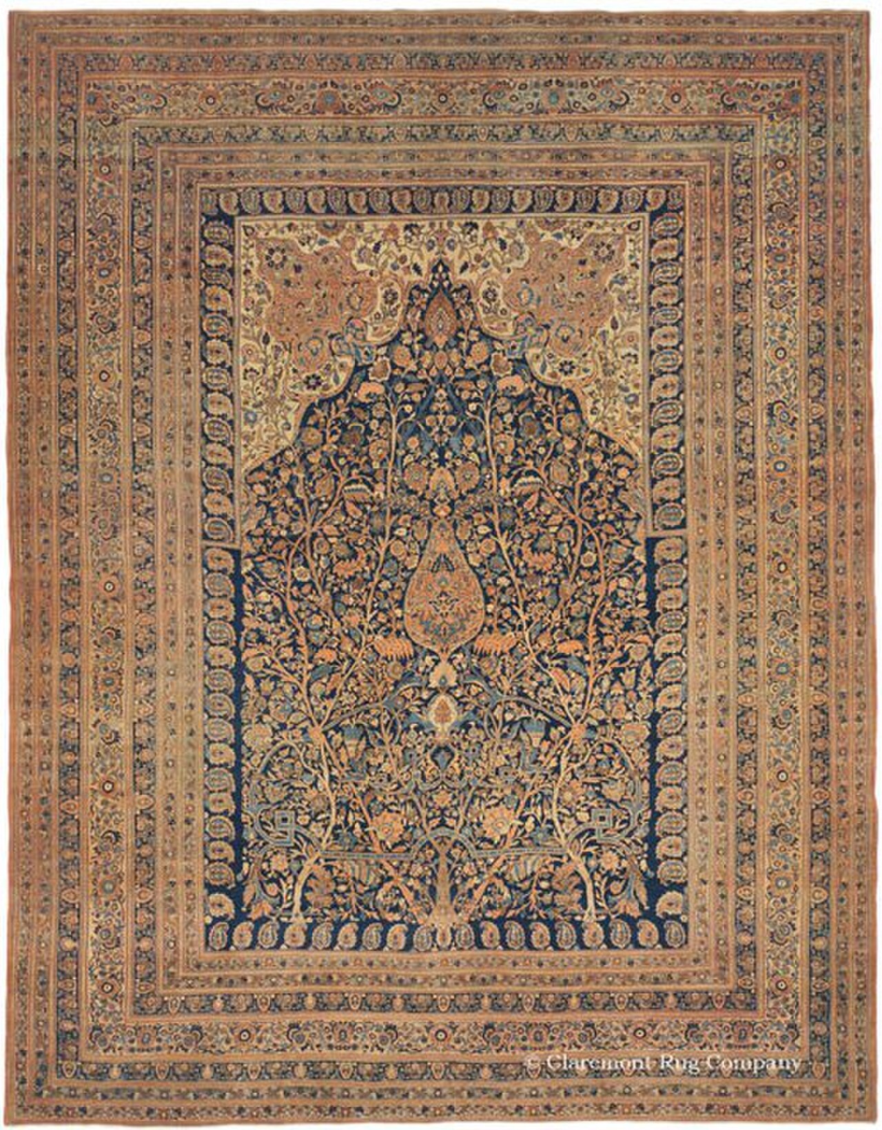 Die charakteristische Haji-Jalili-Palette unterscheidet sich deutlich von der klassischen, tiefroten Täbriz-Tradition. Seine Teppiche zeigen meist einen elfenbeinfarbenen oder hellbeigen Grund mit gedämpften Akzenten in Lachsrot, Altgold, Salbeigrün und gebrochenem Blau. Typische Motive sind Bäume des Lebens, Zypressenreihen, Weidenblätter und florale Medaillons — alle in extrem feiner Ausführung, oft mit seidenen Konturen.