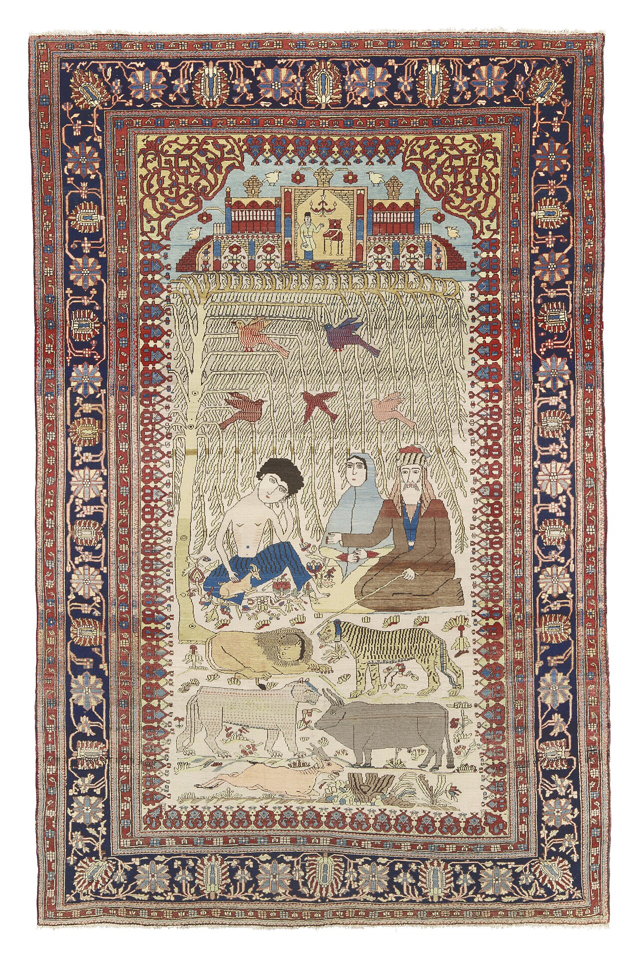 Mohtesham knüpfte überwiegend klassische MedaillonMedaillonZentrales Motiv im Teppichfeld, meist oval oder rautenförmig. Eines der häufigsten Designelemente in persischen Teppichen.Im Glossar lesen →-Teppiche mit floraler BordüreBordüreUmlaufender Rahmen eines Teppichs, meist aus mehreren parallelen Streifen mit unterschiedlichen Mustern, der das Mittelfeld einfasst.Im Glossar lesen →, oft mit den aus Safawiden-Manuskripten übernommenen Shah-Abbas-Palmetten und HeratiHeratiKlassisches Muster aus einem Rautenrahmen mit zentraler Rosette und vier gebogenen Blättern (Fisch-Motiv). Sehr verbreitet in persischen Dorfteppichen.Im Glossar lesen →-Feldern. Eine Untergruppe sind figurale „pictorial Keschans" mit biblischen, mythologischen oder höfischen Szenen — etwa der abgebildete Teppich mit einer Darstellung Josefs bei seinen Brüdern. Solche Bildteppiche waren Auftragsarbeiten für persische, europäische und amerikanische Kunden der damaligen Zeit.